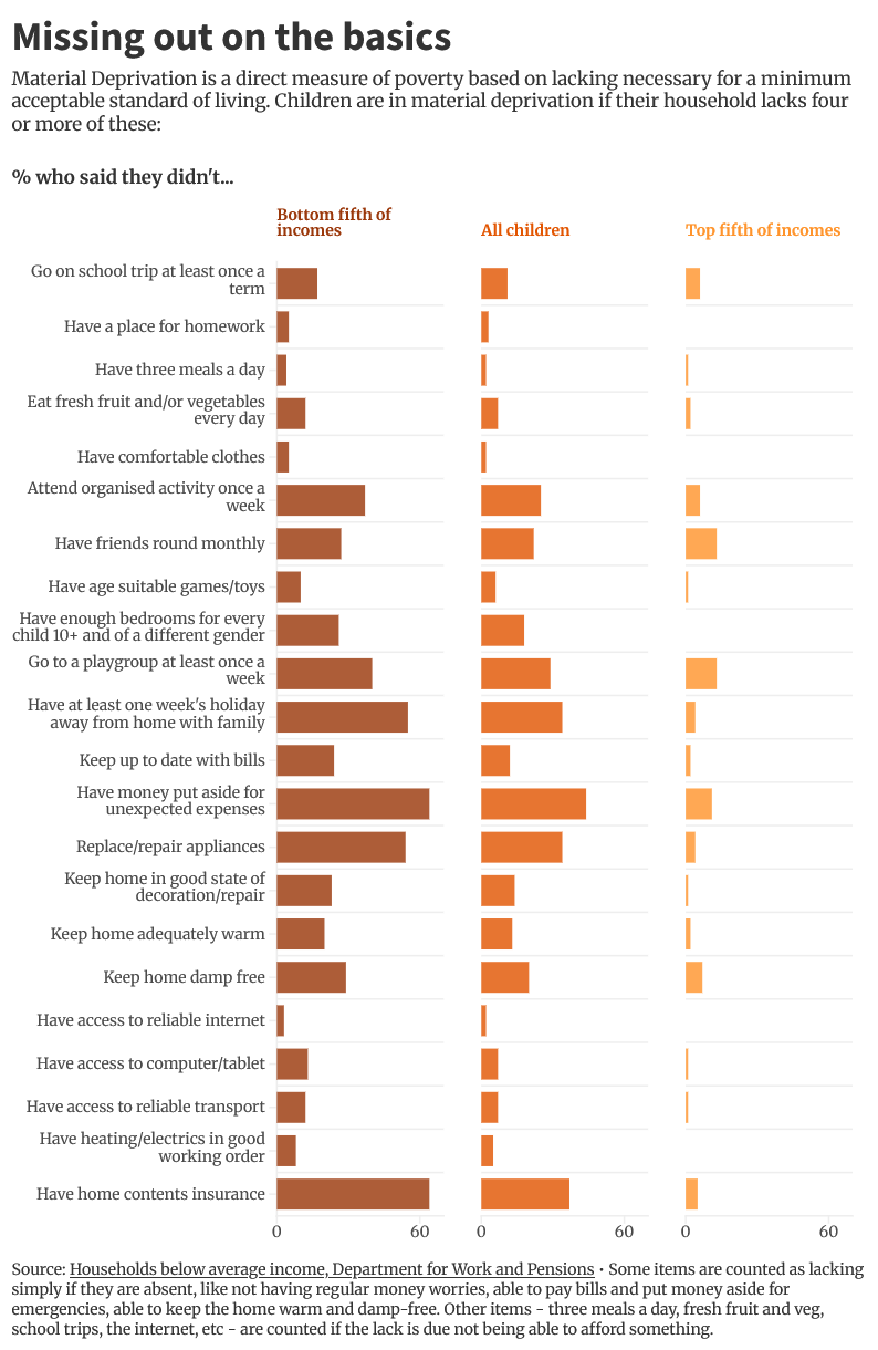 In the year to April 2024, 4 million children were in material deprivation in the UK, which was 28 per cent of all children. This means they may live in households that struggle to pay bills or can’t afford to keep homes warm and damp-free. They may miss out on toys, school trips, hobbies and having friends over.