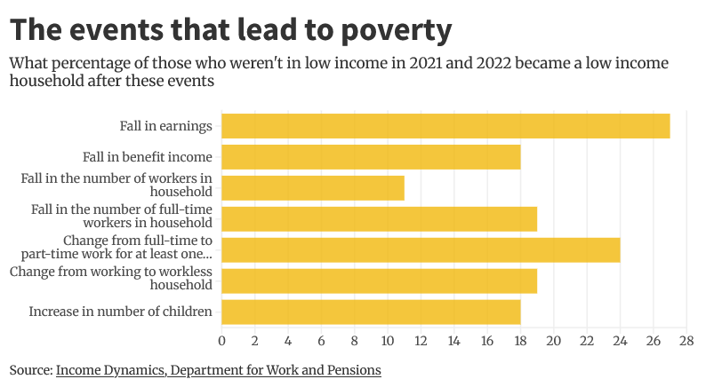 A fall in earnings is the event most likely to put household incomes below the poverty line. But nearly a fifth of families (18 per cent) tip into poverty after the arrival of a new child. Knock-on impacts like someone giving up work for childcare add to the risk.