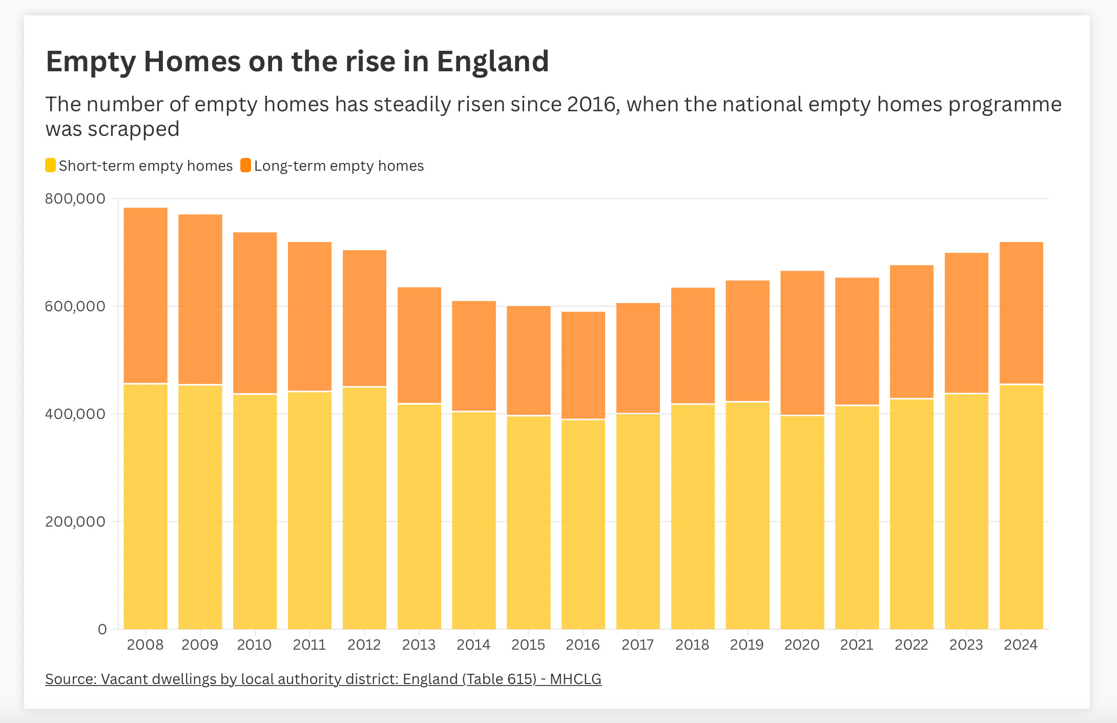 Since 2016, while the number of households needing temporary accommodation has increased by 73 per cent to record levels, long-term empty homes also rose by a third to 264,884. Empty homes are just one part of the housing crisis, but one that is increasingly seen as a key piece of the puzzle.