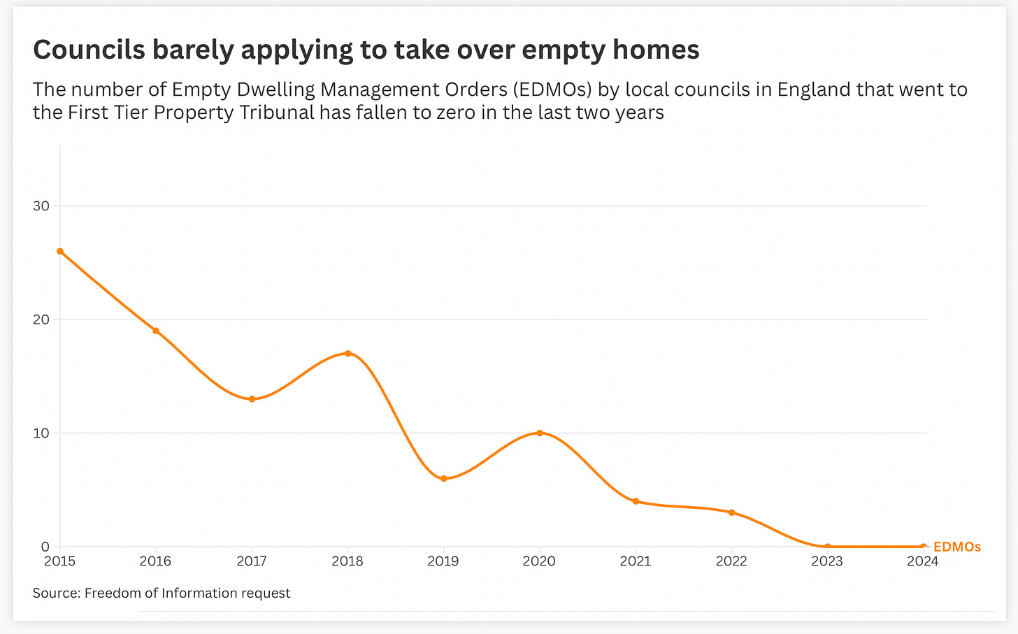 He admits that no EDMOs going to the property tribunal is “shocking” but points out this doesn’t capture cases where councils send out the three-month letters of notice to the owner, which is enough to provoke action. “I know it happens all over the country that councils threaten an EDMO,” he says.